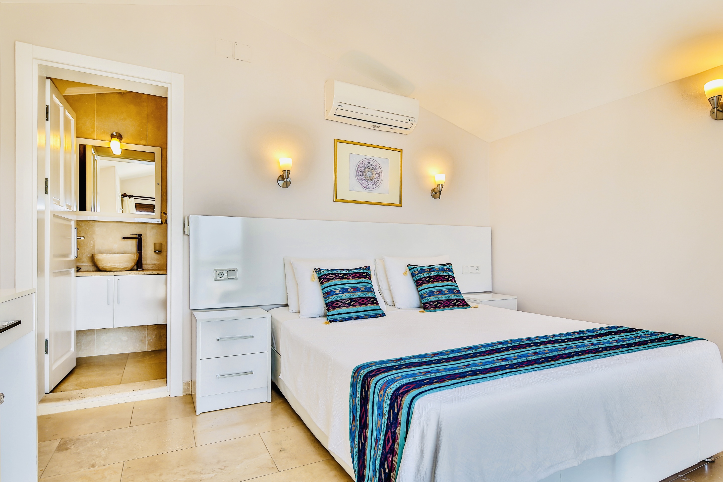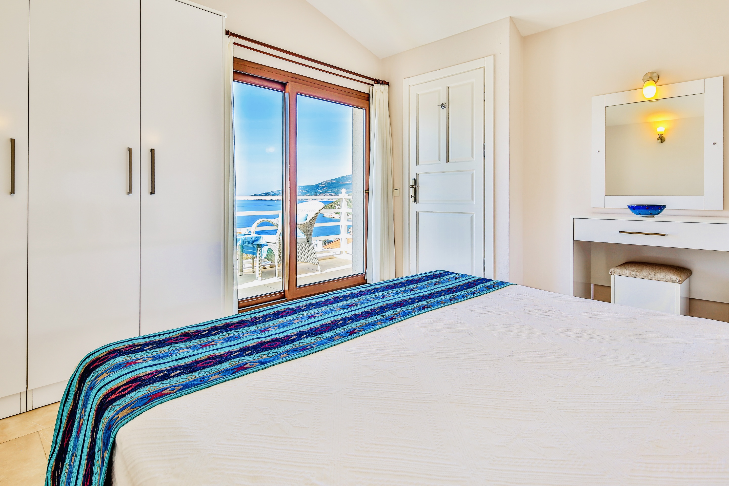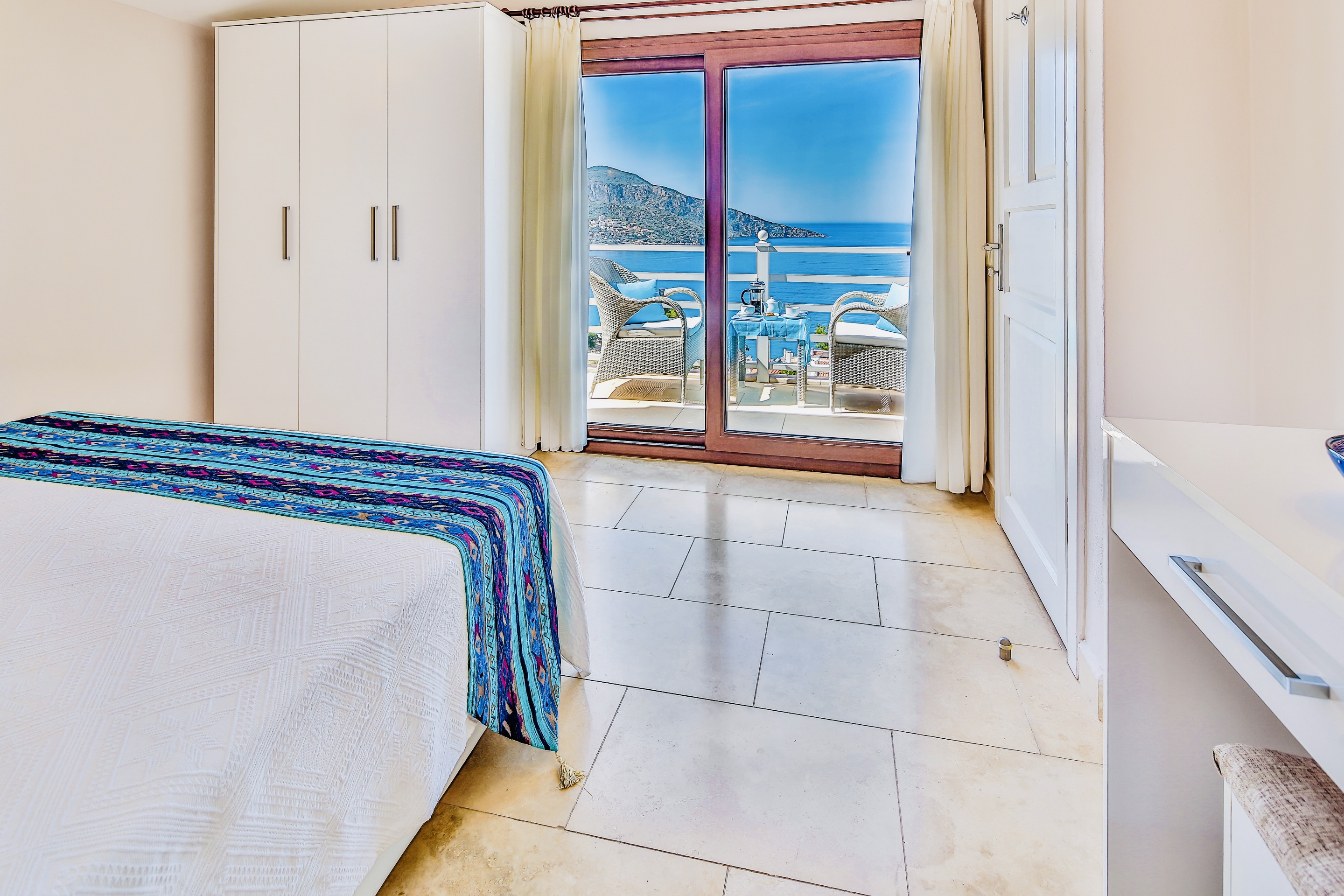 Bedroom 1 is located on the top floor of the block and is accessed by it’s own private staircase from the lounge area. It is an elegantly furnished double room en-suite room and boasts unrivalled views of the bay and islands. Outside it has its own private balcony, with stunning sea views. This balcony is accessed through the bedroom patio doors and is equipped with 2 chairs and a small table. It’s a great spot for sitting with a coffee in the mornings and watching the boats leave the harbour.