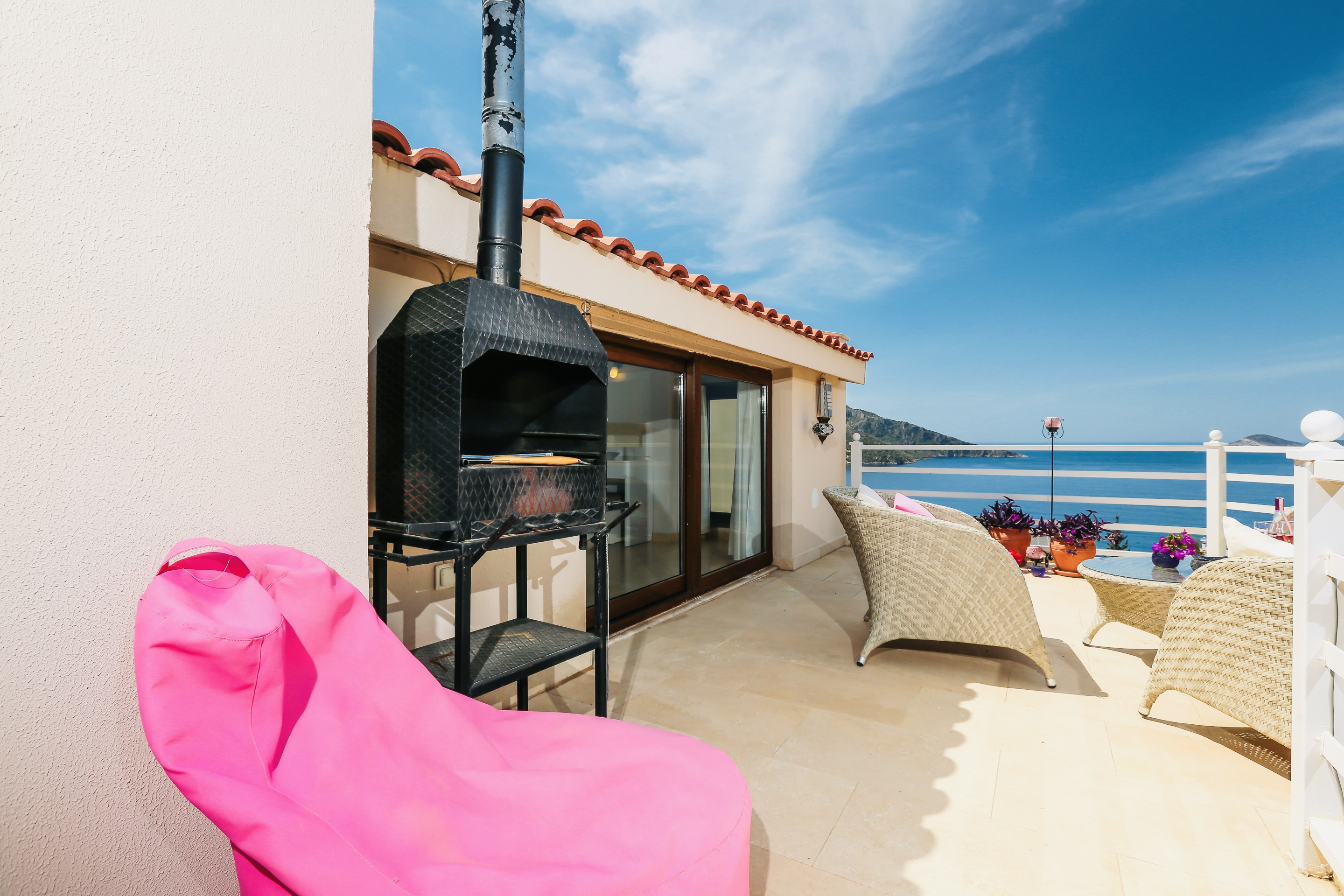 The Main Balcony can be accessed through it’s own door from the top landing area, or directly from bedroom 2 patio doors. This is the largest balcony with fantastic views over the bay and islands. It is fully equipped with a 2 seater sofa, 2 easy chairs and a coffee table, as well as bean bags and foldable chairs/sun beds. There is also a small kitchen area which has a sink and a fridge. The BBQ is also located on this level. This is a fantastic space for sundowner cocktails or just chillin throughout the day!